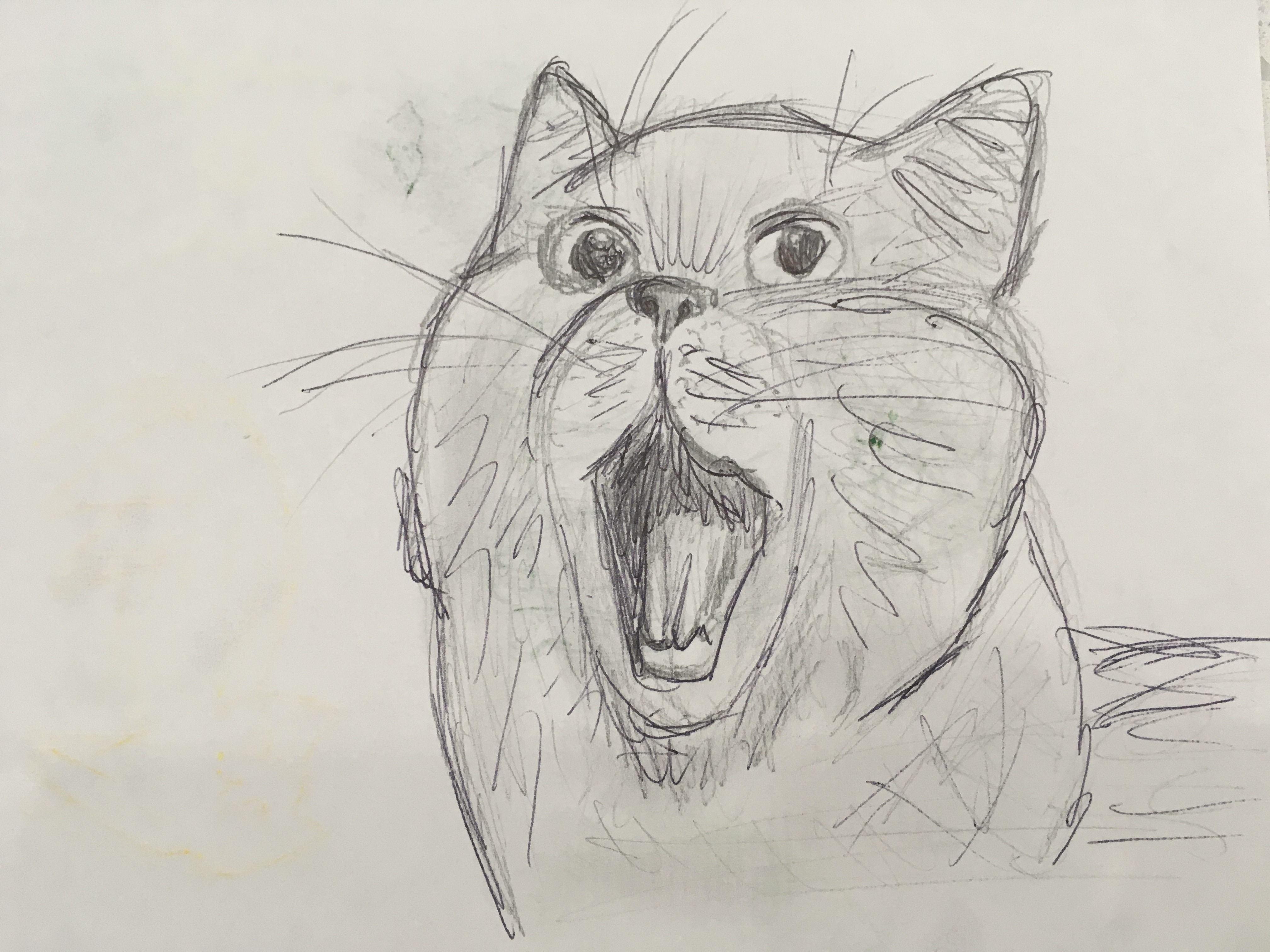 A cat with its mouth open. Date: December 30, 2021 Medium: Pencil and pen on paper. Description: A cat with its mouth open. Category: Cats, Animals (With Cats), Graphite