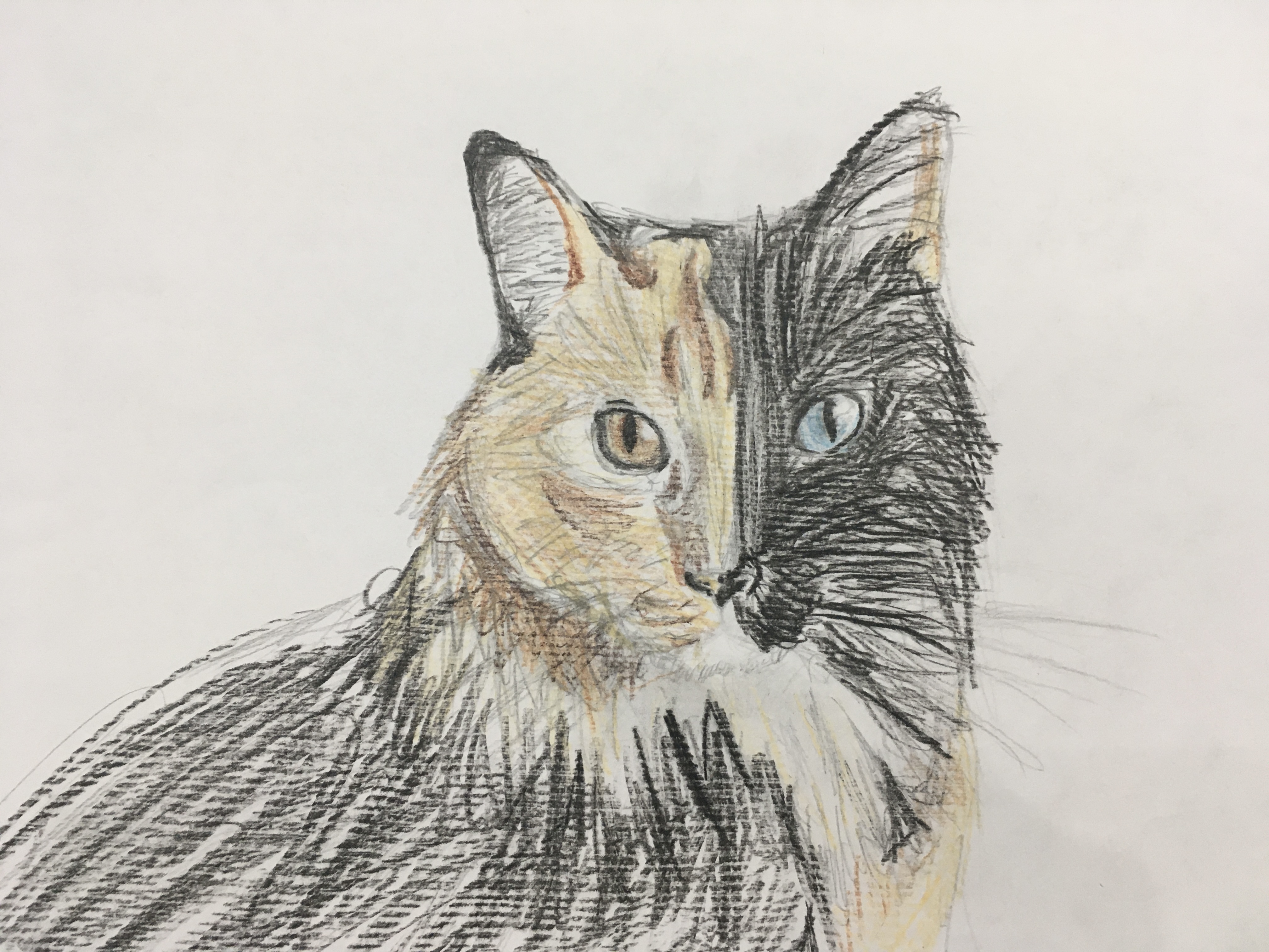 A black and orange cat with brown and blue eyes. Date: January 14, 2022 Medium: Colored pencil on paper. Description: A black and orange cat with brown and blue eyes. Category: Cats, Animals (With Cats), Colored Pencil