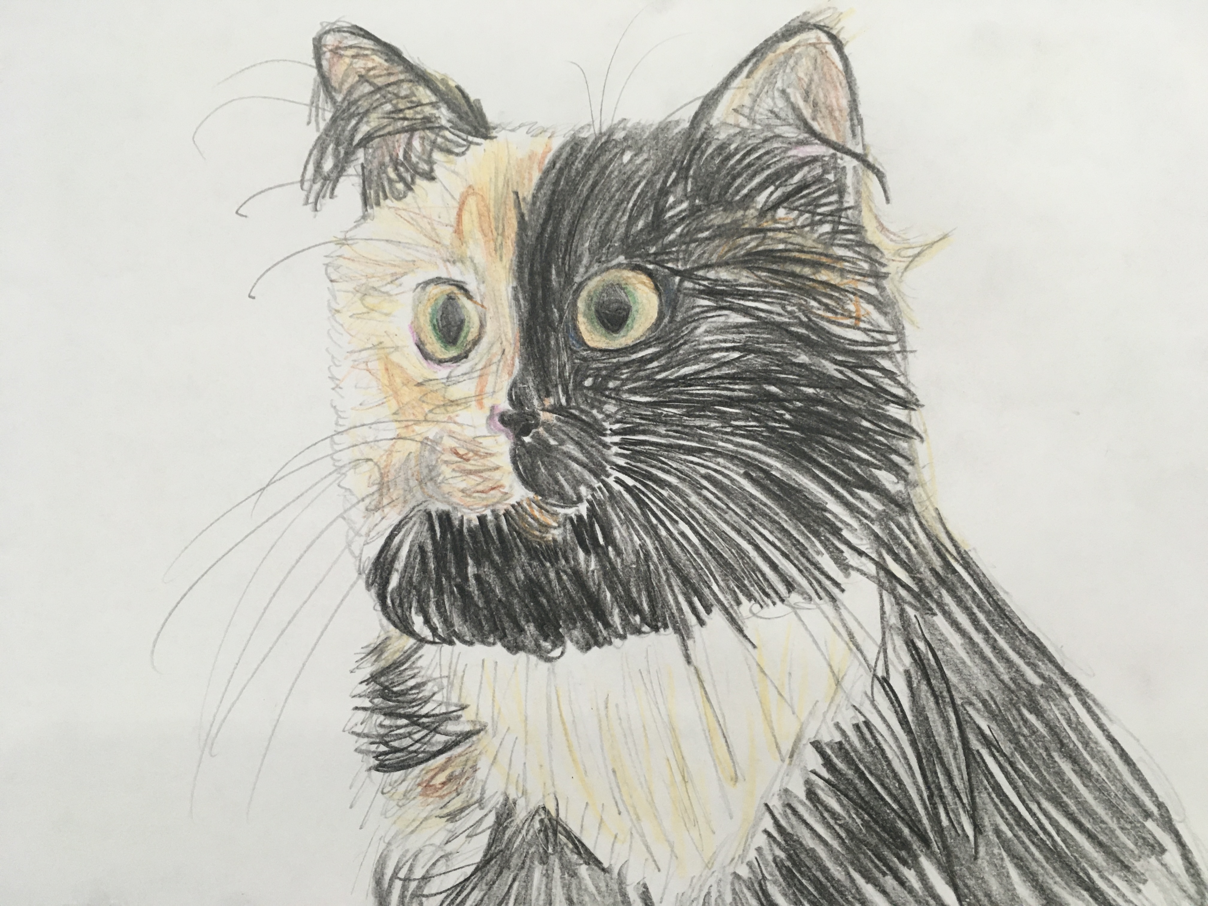 A black and orange cat with yellow eyes. Date: January 16, 2022 Medium: Colored pencil on paper. Description: A black and orange cat with yellow eyes. Category: Colored Pencil, Animals (With Cats), Cats