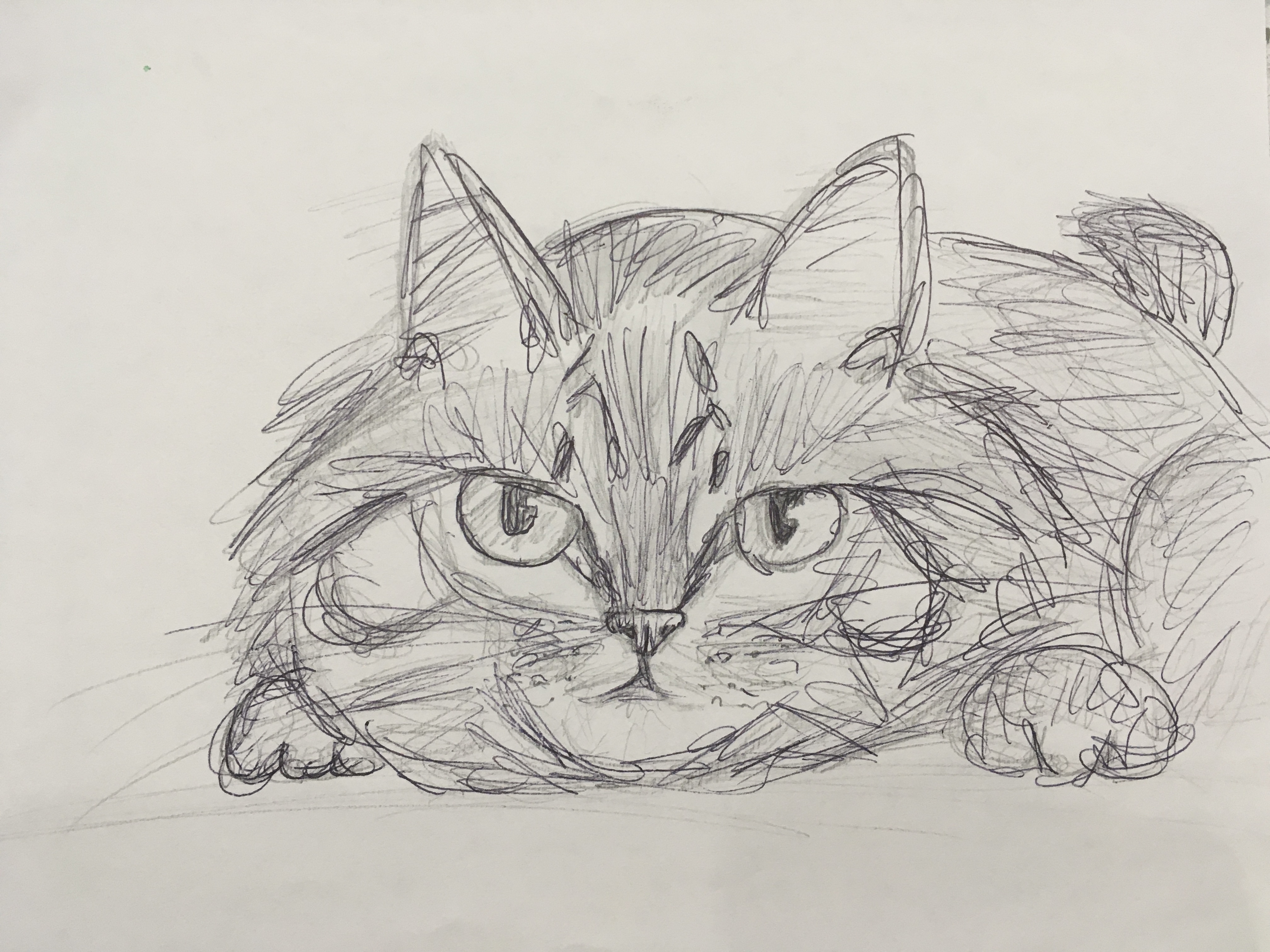 A fluffy striped cat laying down. Date: December 30, 2021 Medium: Pencil and pen on paper. Description: A fluffy striped cat laying down. Category: Cats, Animals (With Cats), Graphite