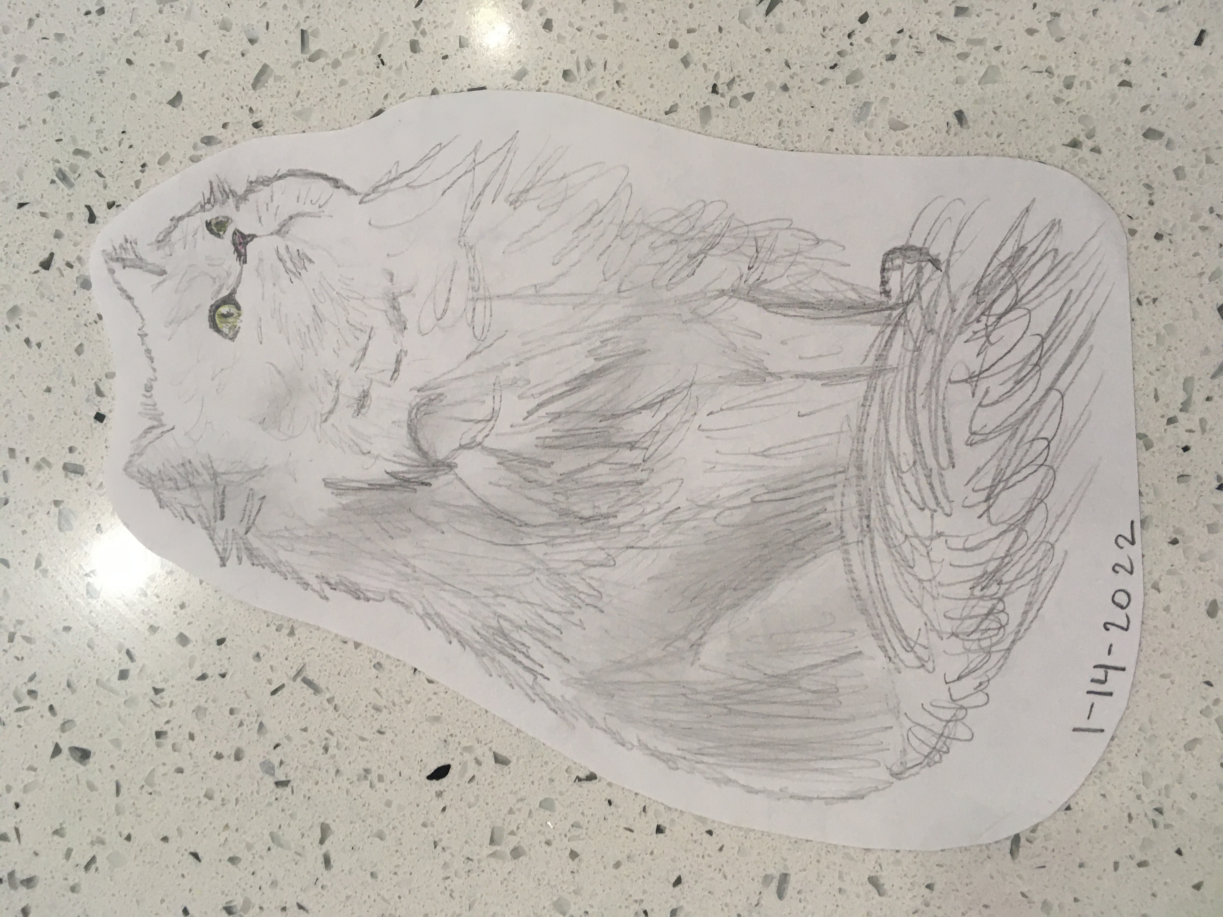 A fluffy white cat with green eyes looking up. Date: January 14, 2022 Medium: Pencil on paper. Description: A fluffy white cat with green eyes looking up. Category: Cats, Animals (With Cats), Graphite