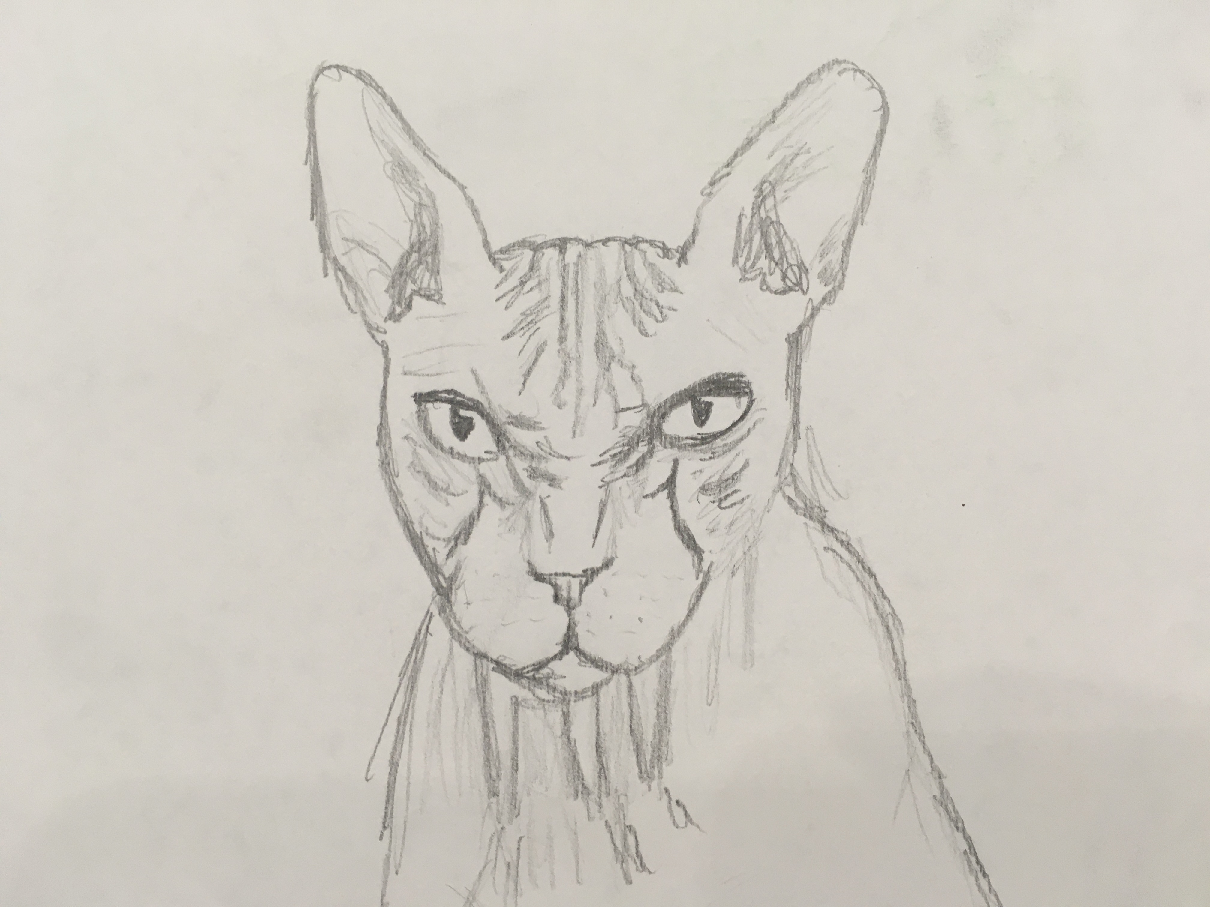 A Sphinx cat sketch. Date: December 30, 2021 Medium: Pencil on paper. Description: A Sphinx cat sketch. Category: Cats, Animals (With Cats), Graphite