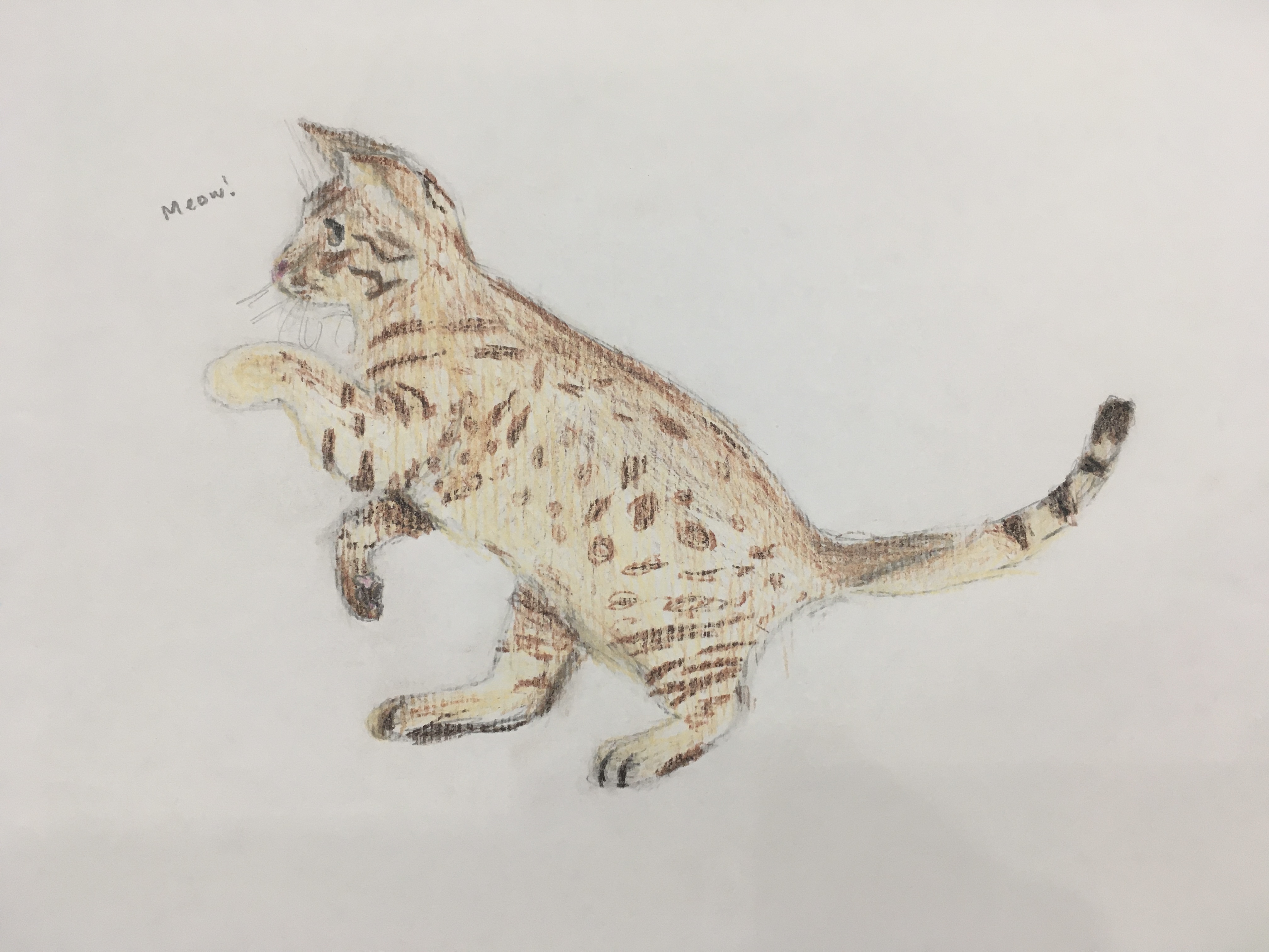 A spotted tan cat jumping. Date: January 14, 2022 Medium: Colored pencil on paper. Description: A spotted tan cat jumping. Category: Cats, Animals (With Cats), Colored Pencil