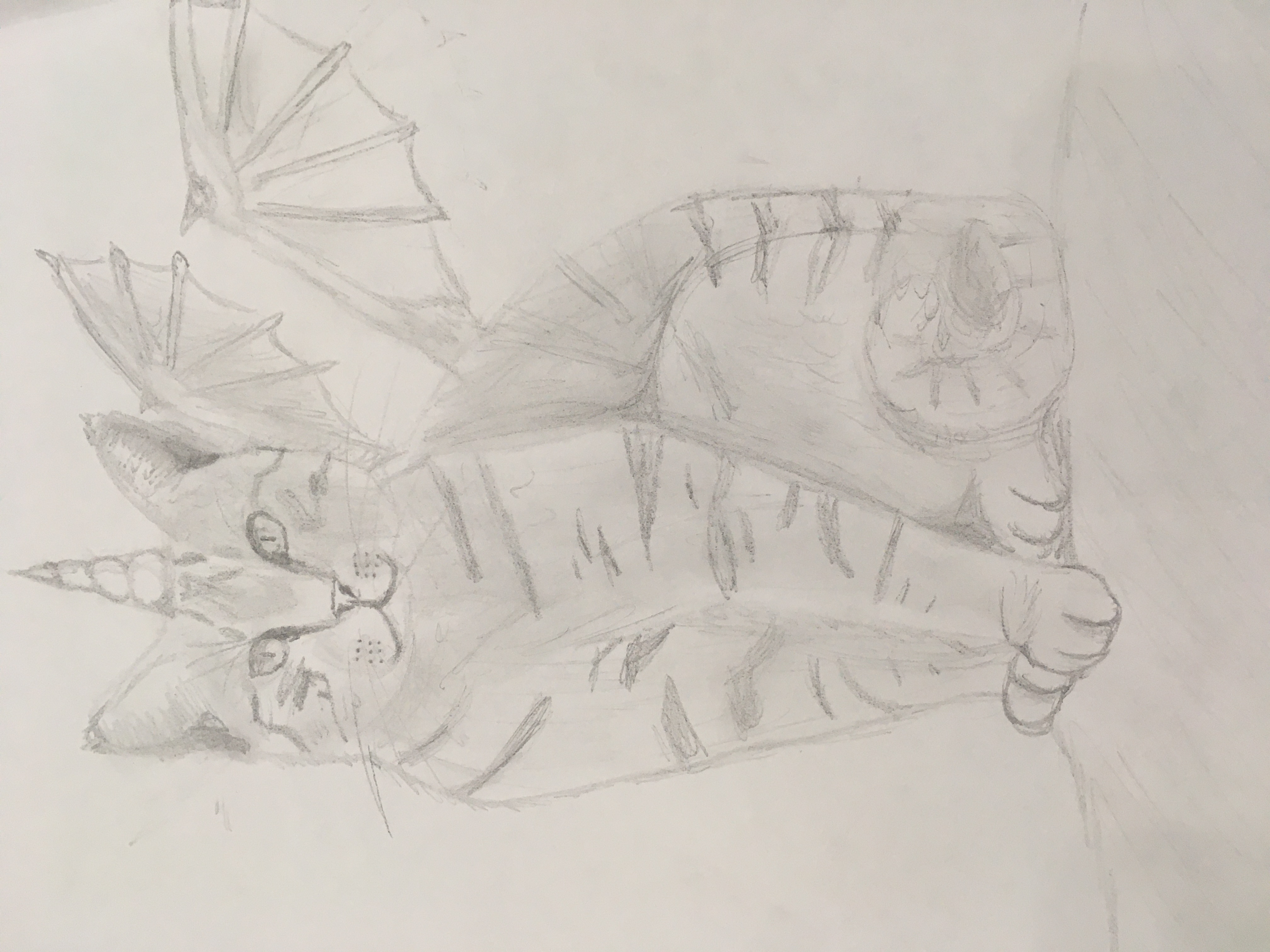 A unicorn dragon cat. Date: December 17, 2021 Medium: Pencil on paper. Description: A unicorn dragon cat. Category: Graphite, Animals (With Cats), Cats