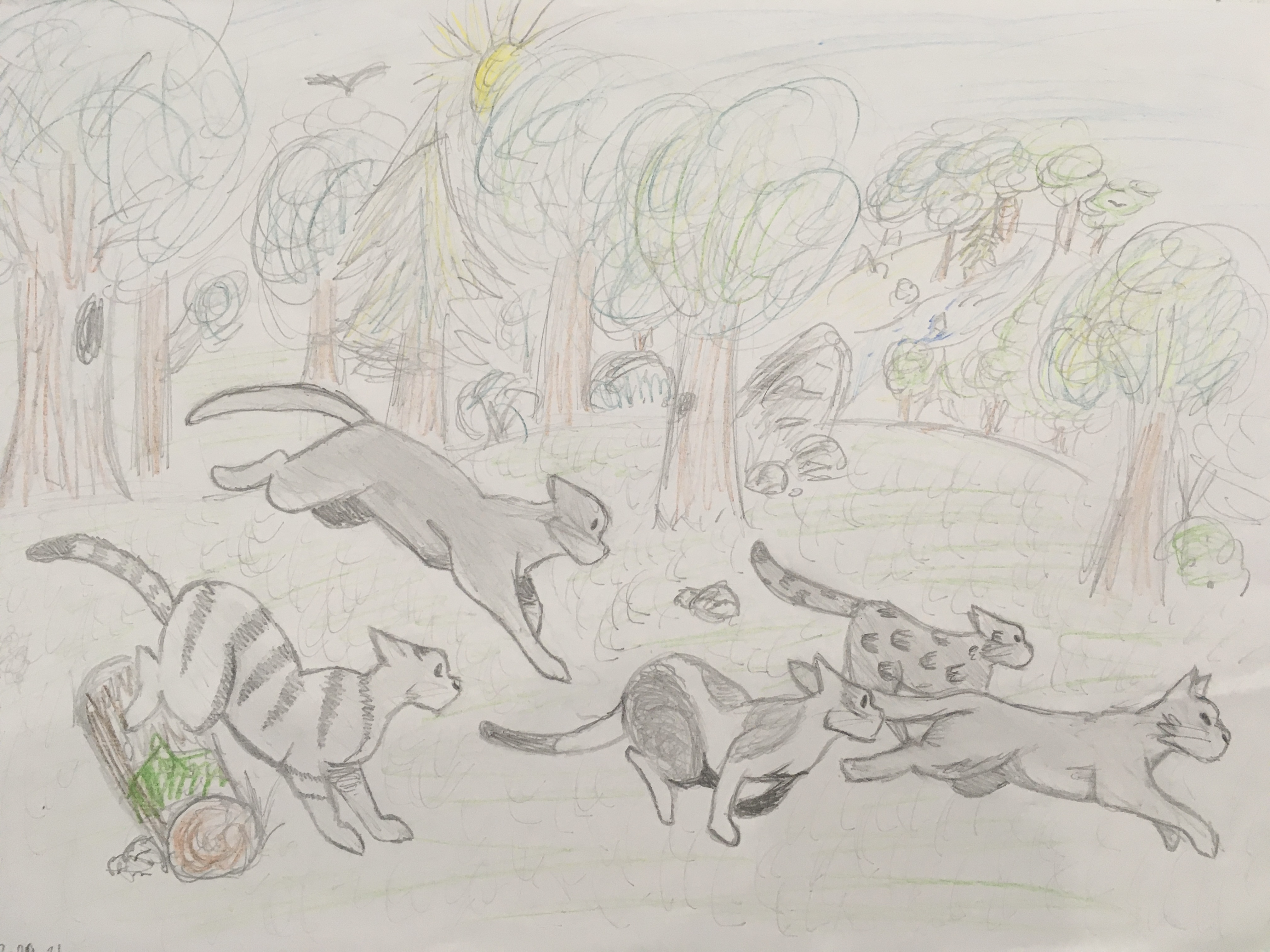 Five cats running through a forest. Date: December 29, 2021 Medium: Colored pencil and pencil on paper. Description: Five cats running through a forest. Category: Animals (With Cats), Graphite, Colored Pencil, Cats
